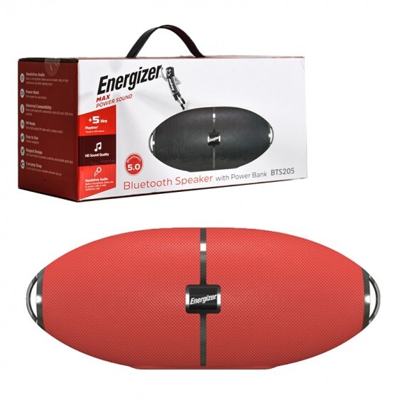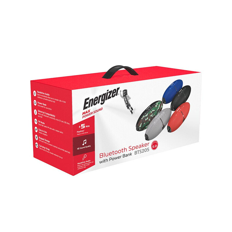 این اسپیکر بلوتوث با الهام از توپ راگبی طراحی شده است و طراحانان اسپیکر BTS205 با این ظاهر قدرت این اسپیکر را به رخ کشیدهاند. علاقه مند به گوش دادن موسیقی در هر زمان و مکانی هستید؟ آیا شما هم همیشه یک فلش مموری با آهنگ های مورد علاقه خود را همراهتان دارید؟ با اسپیکر بلوتوث مدل BTS205 انرجایزر میتوانید در هر جا به موزیکهای داخل فلش مموری خود گوش کنید. توان 10 واتی این اسپیکر تضمین کننده صدایی با کیفیت و صاف است و با فرکانس 30Hz-20kHz هرتز خود محدوده شنوایی شما را پوشش میدهد. علاوه بر فلش مموری که در بالا اشاره شد اسپیکر بلوتوث انرجایزر از رم میکرو و کابل AUX نیز پستیبانی میکند. فراموش نکنید که این اسپیکر یک اسپیکر بلوتوثی است و شما آن را به هر پلیری که قابلیت بلوتوث دارد میتوانید کانکت کنید. این محصول از رادیو FM هم پشتیبانی میکند و شما میتوانید برنامه رادیوی مورد علاقه خود را با آن دنبال کنید. امکان ویژه دیگری که در این محصول تعبیه شده است، قابلیت استفاده این محصول به عنوان پاوربانک است. یعنی با یک تیر چند نشان میزنید.